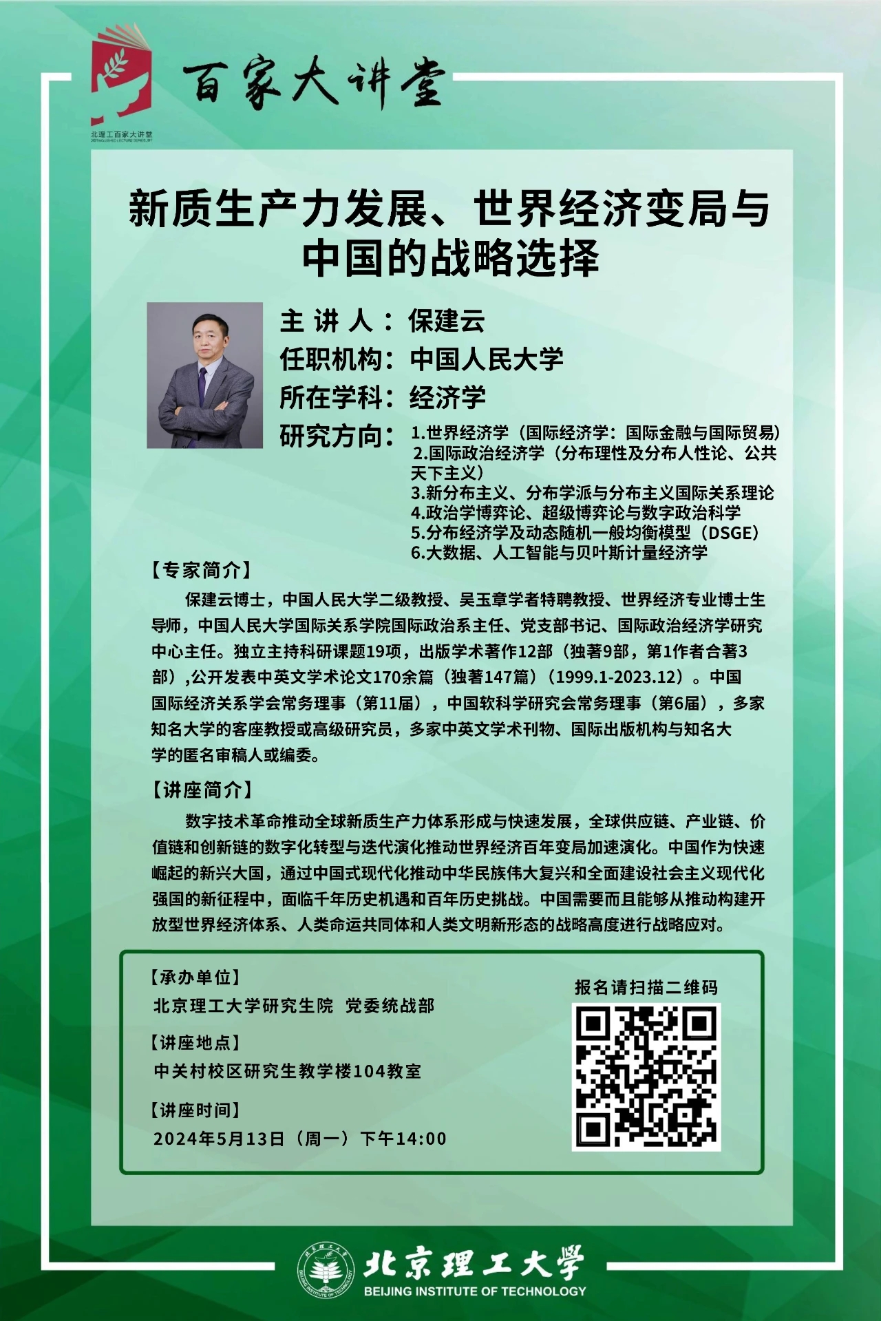?>?【百家大講堂】保建云教授作題為“新質生產力發展、世界經濟變局與中國的戰略選擇”的講座預告