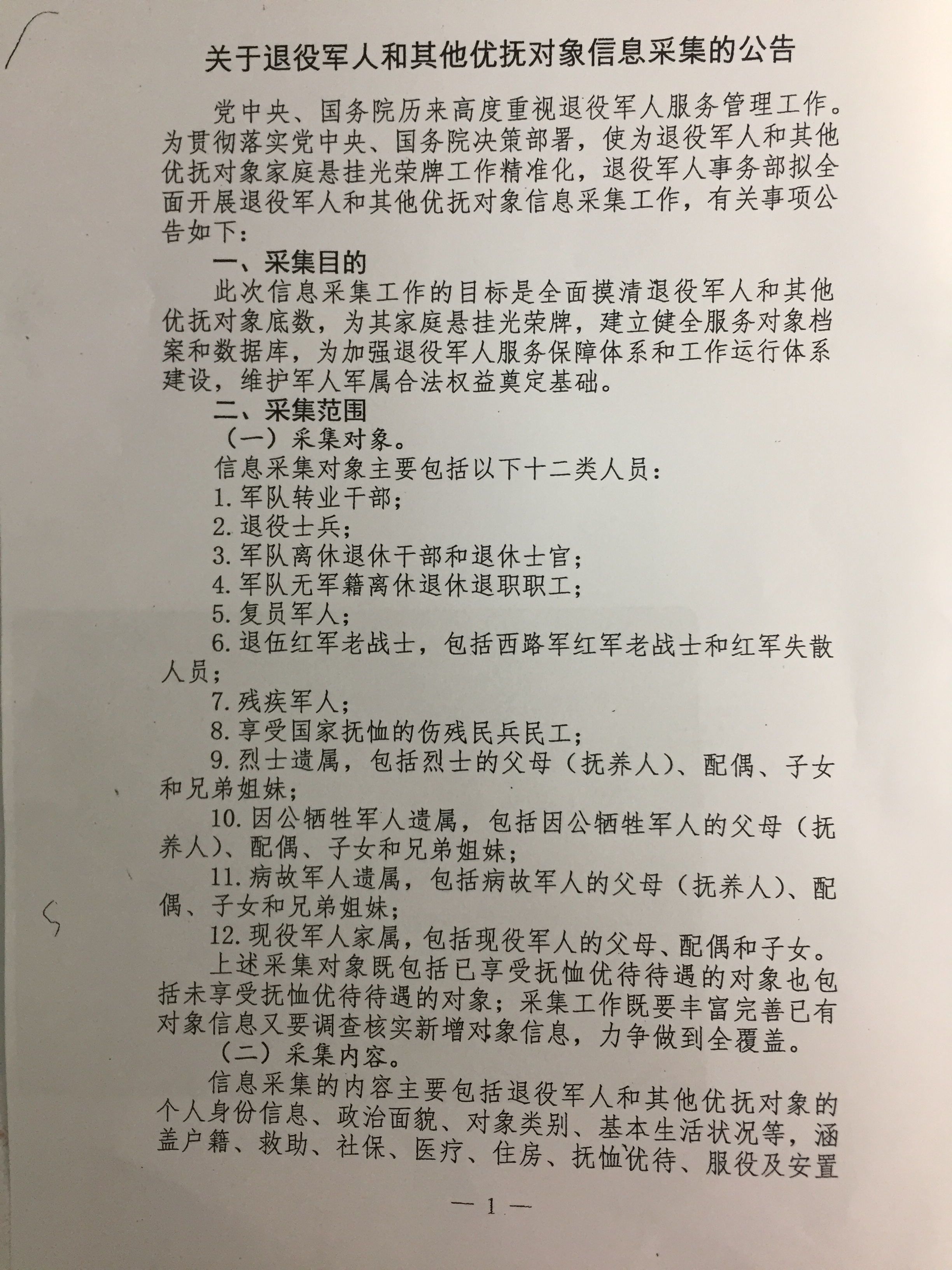 采集范圍:1.軍隊轉業干部      2.退役士兵     3.軍隊離休退休干部和退休士官     4.軍隊無軍籍離休退休退職職工      5.復員軍人     6.退伍紅軍老戰士      7.殘疾軍人      8.享受國家撫恤的傷殘民兵民工     9.烈士遺屬,包括烈士的父母(撫養人)、配偶、子女和兄弟姐妹    10.因公犧牲軍人遺屬,包括因公犧牲軍人的父母(撫養人)、配偶、子女和兄弟姐妹      11.病故軍人遺屬,包括病故軍人的父母(撫養人)、配偶、子女和兄弟姐妹      12.現役軍人家屬,包括現役軍人的父母、配偶、子女
