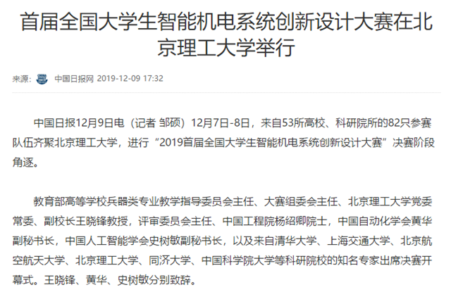 12月7日-8日,來自53所高校、科研院所的82只參賽隊伍齊聚北京理工大學,進行“2019首屆全國大學生智能機電系統創新設計大賽”決賽階段角逐。