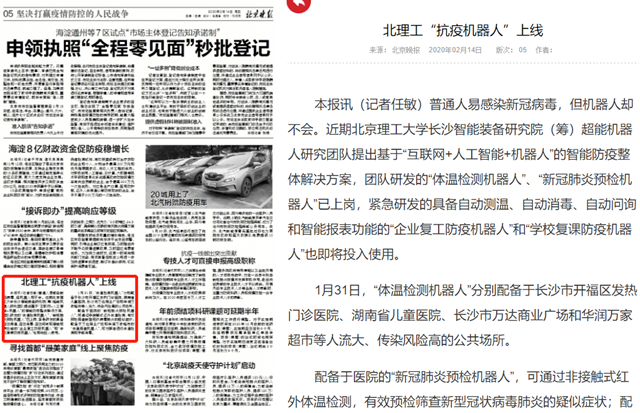 普通人易感染新冠病毒,但機器人卻不會。近期北京理工大學長沙智能裝備研究院(籌)超能機器人研究團隊提出基于“互聯網+人工智能+機器人”的智能防疫整體解決方案,團隊研發的“體溫檢測機器人”、“新冠肺炎預檢機器人”已上崗,緊急研發的具備自動測溫、自動消毒、自動問詢和智能報表功能的“企業復工防疫機器人”和“學校復課防疫機器人”也即將投入使用。