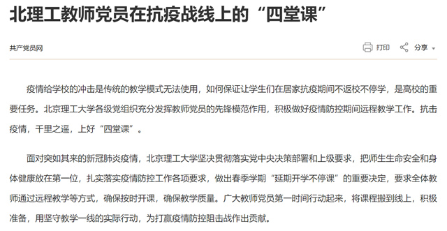 疫情給學校的沖擊是傳統的教學模式無法使用,如何保證讓學生們在居家抗疫期間不返校不停學,是高校的重要任務。北京理工大學各級黨組織充分發揮教師黨員的先鋒模范作用,積極做好疫情防控期間遠程教學工作。抗擊疫情,千里之遙,上好“四堂課”。