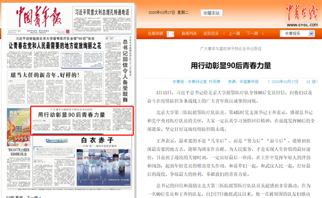 3月15日,習(xí)近平總書(shū)記給北京大學(xué)援鄂醫(yī)療隊(duì)全體90后黨員回信,向他們以及奮斗在疫情防控各條戰(zhàn)線上的廣大青年致以誠(chéng)摯的問(wèn)候。
