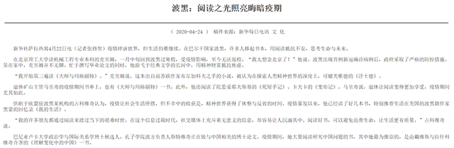 “我的許多朋友都通過閱讀來渡過當下的艱難時世。在這個信息過載時代,社交媒體上充斥著無意義的信息,卻容易讓人沉溺其中。閱讀好書,可以避免浪費生命,讓生活更有質量?!闭伎凭S奇說。