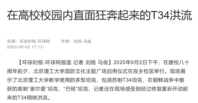 2020年9月2日下午,在建校八十周年前夕,北京理工大學國防文化主題廣場啟用儀式在良鄉校區舉行。現場展示了北京理工大學教學使用的多型坦克,包括蘇制T34坦克,在朝鮮戰爭中繳獲的美制“謝爾曼”坦克、“巴頓”坦克,記者還在現場感受到經過修復重新開動起來的T34鋼鐵洪流。