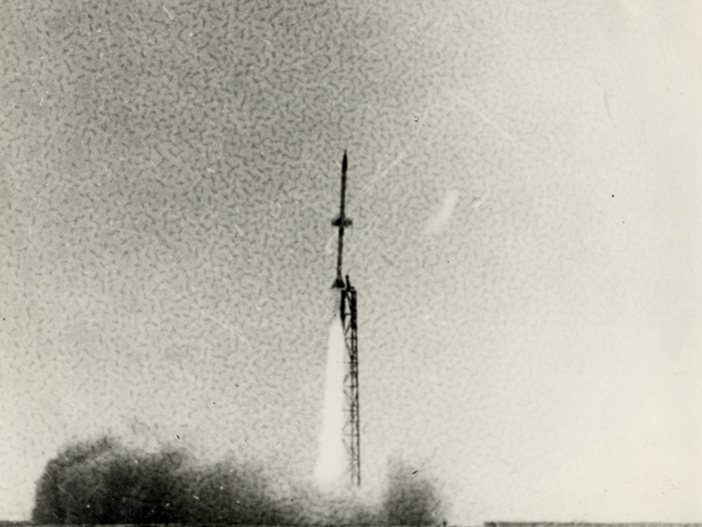 (北京工業學院研制中國首枚二級固體高空探測火箭“東方-1號”發射瞬間)