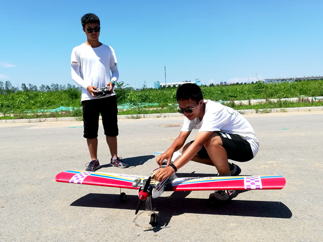 張智鐸參與的航模1kg項目,可以說是航模隊各個項目中難度較大、失敗率較高的。該項目的設計目標是保證空機質量不超過1kg的情況下攜帶更多的載荷。但是在實際飛行訓練中,由于載荷過重,飛機模型經常出現起落架不穩定的情況,造成飛機滑跑時出現急轉,甚至折斷起落架碳管。為了解決這個棘手的問題,張智鐸和他的隊友們一次又一次討論改進方案,從后起支撐方式、起落架制作工藝等方面進行了嘗試與改進,終于使起落架性能趨于穩定,飛機模型滑跑急轉的問題得到了有效改善。“如果我們進行的調整不能解決問題,就要重新分析原因,提出新的方案,嘗試很多次卻沒發現原因是常事。有時候為了一個參數調整,我們就要分析到深夜。” 張智鐸這樣說道。