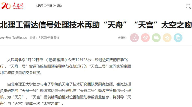 【人民網(wǎng)】北理工雷達(dá)信號(hào)處理技術(shù)再助“天舟”“天宮”太空之吻