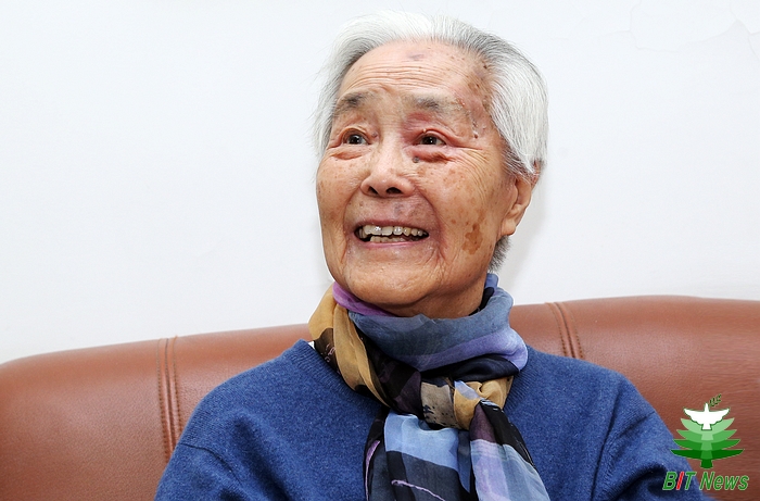在三里河的家中,我們見到了這位老校友?;ò椎念^發映襯著她白晰的臉龐,滄桑的皺紋訴說著歲月的變遷。她身體消瘦,精神矍鑠,要不是介紹,真看不出這位老者已是95歲的高齡。雖然衣著簡樸,藍色的袖口已經起了毛邊,但是依然不能掩蓋她那婉約高貴的氣質。說起話來,她微微帶笑,眼睛里全是和氣,淺淺的、淡淡的,像盛開的葵花一樣溫暖——歲月帶給她的是恬靜安詳的內心和堅定忠誠的信仰。