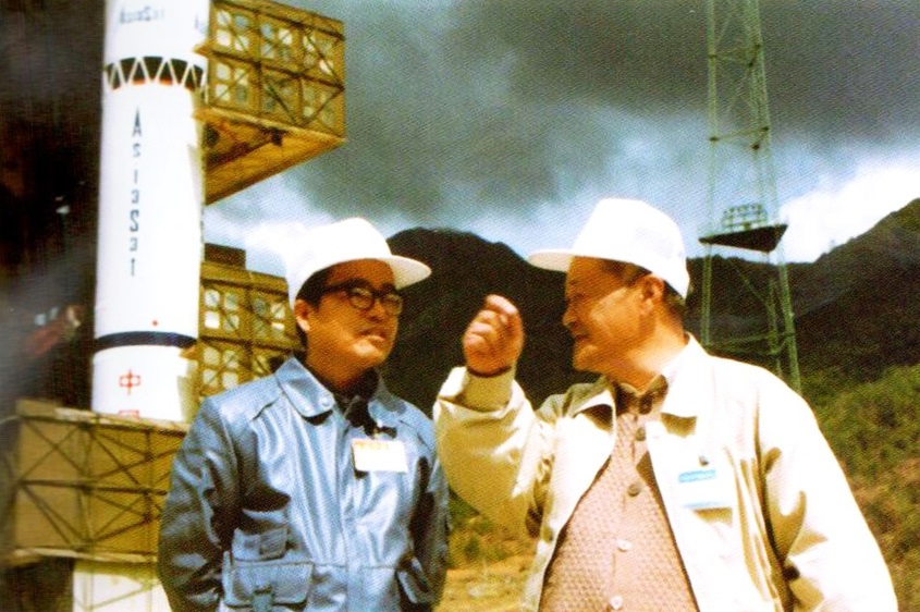 1990年4月,謝光選(右)與航天一院黨委書記沈辛蓀在發射現場