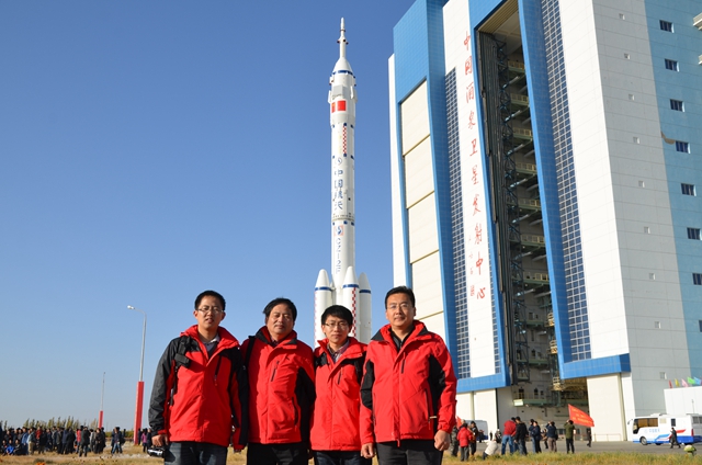 楊春華與項(xiàng)目組部分師生在“神舟八號(hào)”酒泉衛(wèi)星發(fā)射中心現(xiàn)場(chǎng)