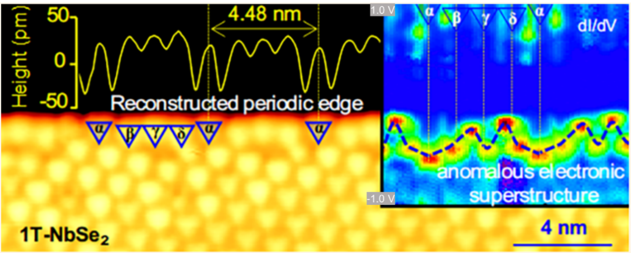 利用分子束外延(MBE)技術構筑了原子級平整邊界,發現邊界處的CDW元胞由體內有序的CDW晶格自發地演化重構成四聚體。此外,還發現沿邊界出現了反常的電子超結構,其周期是普通CDW晶格的4倍。每個周期由4個不等價CDW組成,并呈現由結構調制的相應電子態超結構,實現了對自旋陣列尺寸和維度的深入調控。