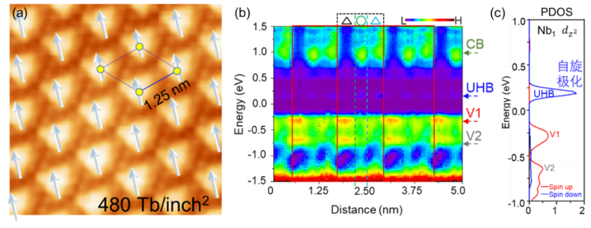 研究了莫特態的上哈伯德能帶(UpperHubbard Band,UHB)和CDW的軌道之間的空間反相分布關系,測量并闡明了單層1T-NbSe2每個CDW格點在UHB態的能量具有自旋極化特性,可作為低功耗的信息存儲點。信息點間距為1.25nm,自旋信息存儲密度高達480 Tb/inch2 (每平方英寸480兆兆比特)。