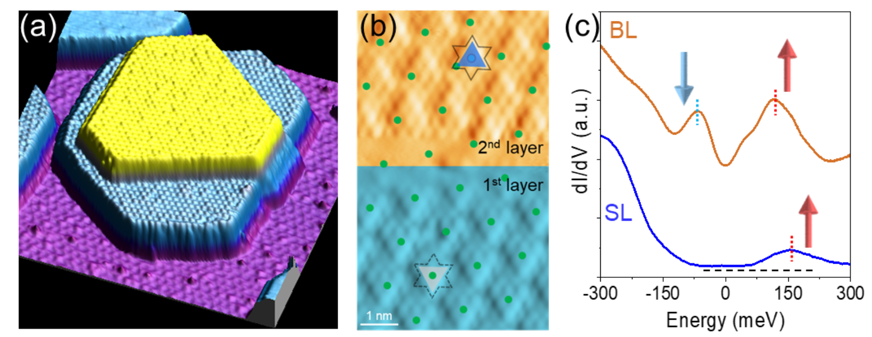 圖4. (a)雙層轉角疊層結構的三維形貌圖。(b)雙層形貌的原子分辨圖。(c)單雙層NbSe2的微分電導譜,零偏壓附近的兩個電子態分別呈現出向上和向下的自旋,與單層相比,雙層的自旋信號明顯加強。