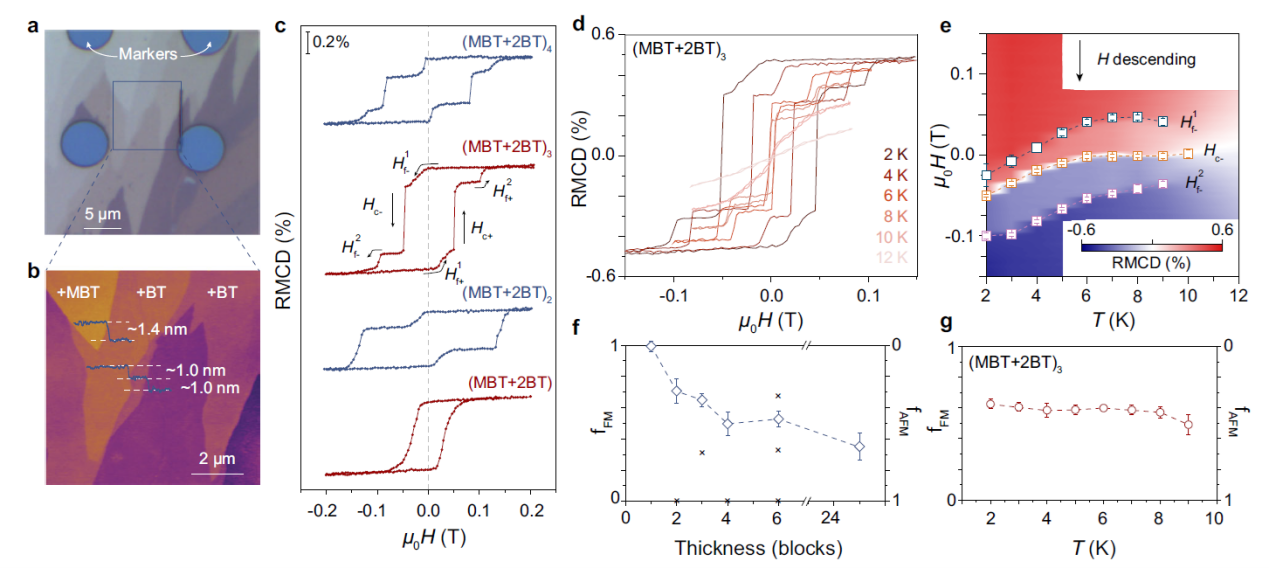 圖1. a-b MnBi6Te10少層樣品光學照片及表面形貌掃描;c少層MnBi6Te10 RMCD- μ 0 H 磁翻轉曲線;d-e 3層MnBi6Te10磁翻轉溫度依賴;f-g鐵磁-反鐵磁占比隨厚度及溫度變化。