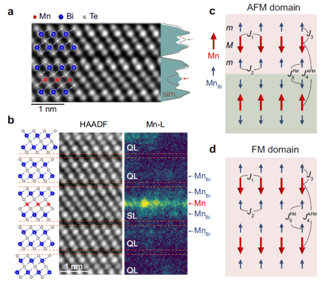 圖2. a-b MnBi6Te10截面STEM及元素空間掃描;c-d MnBi6Te10(及MnBi4Te7)中鐵磁與反鐵磁基態結構。