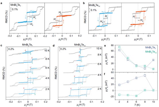 圖3. a-b 6層MnBi6Te中方向可變的交換偏置效應;c-f溫度依賴的交換偏置行為。