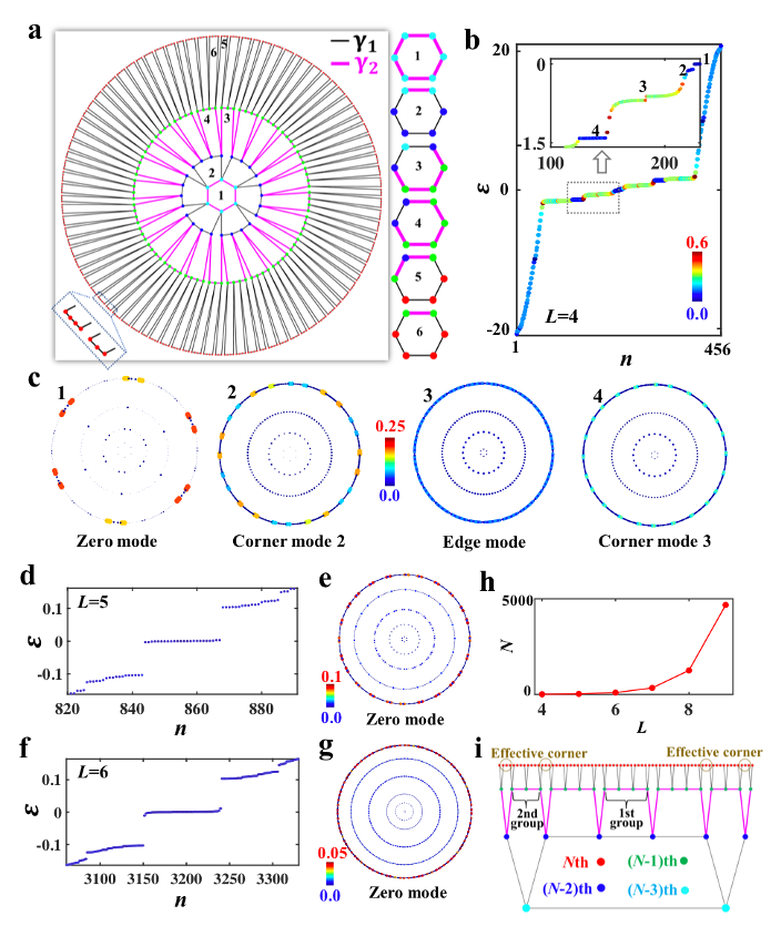 除了一階雙曲量子反常霍爾邊界態(tài),研究人員進(jìn)一步研究了雙曲晶格中的高階零能角態(tài)。所設(shè)計(jì)的雙曲晶格模型顯示在圖3a中,即在{6,4}雙曲晶格中引入二值化(黑線和粉線)的層內(nèi)和層間最近鄰耦合。當(dāng)最外層的耦合強(qiáng)度對(duì)應(yīng)于弱耦合時(shí),高階角態(tài)就會(huì)產(chǎn)生。需要指出的是,不同于歐氏空間中0維角點(diǎn)的幾何特性,雙曲晶格的有效0維角點(diǎn)對(duì)應(yīng)于具有不同耦合方式的最外層格點(diǎn)間的有效界面(如圖3i所示)。圖3b和3c展示了利用數(shù)值對(duì)角化方法計(jì)算的雙曲能譜和相應(yīng)本征態(tài)的空間分布。可以看到雙曲零能模的概率分布局域在最外層的0維格點(diǎn)上,展現(xiàn)了高階拓?fù)浣菓B(tài)的特性。同時(shí),除了零能模,在另外兩個(gè)能量附近也存在雙曲高階角態(tài)。可以發(fā)現(xiàn)與歐氏空間的高階角態(tài)性質(zhì)相似,雙曲高階角態(tài)也總是出現(xiàn)在雙曲邊界態(tài)的帶隙中。研究人員從三個(gè)方面進(jìn)一步對(duì)高階零模的拓?fù)湫再|(zhì)進(jìn)行了證明。首先,通過改變二值化耦合強(qiáng)度的相對(duì)關(guān)系,雙曲能譜發(fā)生了帶隙閉合再打開的過程。同時(shí),該過程伴隨著雙曲高階零能模從無到有的變化過程,是拓?fù)湎嘧兊闹匾卣鳌F浯危p曲高階拓?fù)鋺B(tài)具有與C6-高階拓?fù)浣^緣體相同的拓?fù)湎嘧兲攸c(diǎn)。最后,通過引入無序可以發(fā)現(xiàn)雙曲高階零能角態(tài)具有很強(qiáng)的魯棒性,這與雙曲晶格中由干涉引起的局域化效應(yīng)顯著不同。另外研究人員計(jì)算了不同尺寸下的雙曲能譜和本征態(tài)的分布,如圖3d-3g所示。圖3h給出了雙曲零能模的數(shù)量與雙曲晶格尺寸的關(guān)系。可以看到通過增大雙曲晶格的尺寸,雙曲零能模式的數(shù)量也急劇增加。該現(xiàn)象與分形幾何結(jié)構(gòu)中的高階拓?fù)浣菓B(tài)相似。需要強(qiáng)調(diào)的是,這一新奇的現(xiàn)象是源于雙曲晶格獨(dú)特的邊界響應(yīng),即邊界格點(diǎn)的數(shù)目隨雙曲晶格層數(shù)的增加而呈現(xiàn)指數(shù)增長(zhǎng)的趨勢(shì),使得邊界有效0維角點(diǎn)也具有指數(shù)增長(zhǎng)的特點(diǎn)。