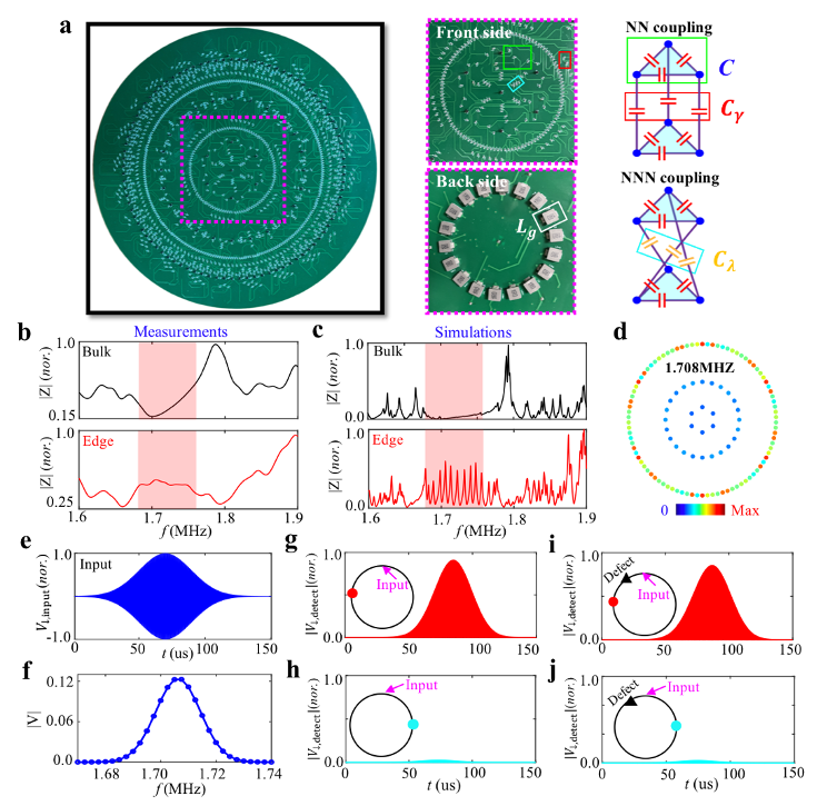 基于凝聚態(tài)晶格模型與電子線路網(wǎng)路的一致性,研究人員設(shè)計(jì)并制備了雙曲電路(如圖2a所示)來觀察邊界統(tǒng)治的雙曲量子反常霍爾效應(yīng)。圖2b和2c分別對(duì)應(yīng)實(shí)驗(yàn)測(cè)量和理論仿真的電路阻抗結(jié)果。電路格點(diǎn)的阻抗響應(yīng)對(duì)應(yīng)于雙曲量子模型的局域態(tài)密度。可以看到,雙曲體點(diǎn)在紅色區(qū)域內(nèi)沒有阻抗峰值,表明存在雙曲體帶帶隙。同時(shí),雙曲電路的邊界格點(diǎn)在該帶隙中存在顯著的阻抗峰值,表明拓?fù)溥吔鐟B(tài)的存在。圖2d展示的是邊界態(tài)所對(duì)應(yīng)頻率下的電路阻抗分布圖。可以看出其與雙曲晶格模型中的拓?fù)溥吘墤B(tài)的概率幅分布完全一致。進(jìn)一步,研究人員通過測(cè)量電壓波包在雙曲電路網(wǎng)路中的時(shí)域特性,清晰地證明了邊界統(tǒng)治的雙曲邊界電壓傳輸,如圖2e-2j所示。
