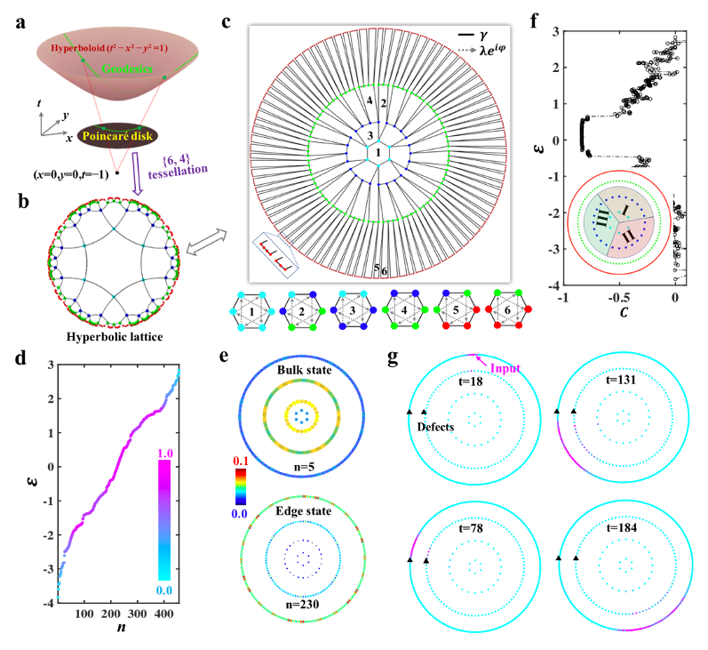為了探究雙曲幾何和拓?fù)溥吔鐟B(tài)的相互作用,研究人員首先將Haldane模型直接推廣到{6,4}雙曲晶格系統(tǒng)中,如圖1a-1c所示。簡(jiǎn)單來講,就是在{6,4}雙曲晶格的每一個(gè)六邊形結(jié)構(gòu)中,都引入實(shí)數(shù)最近鄰耦合和復(fù)數(shù)次近鄰耦合。新生成的模型被稱為雙曲Haldane模型。通過直接數(shù)值對(duì)角化的方法,可以求得有限{6,4}雙曲Haldane模型的本征能譜和相應(yīng)的本征態(tài)分布,如圖1d和1e所示。可以清晰的看到,能量為零附近的本征態(tài)為雙曲邊界態(tài)。為了進(jìn)一步證明雙曲邊界態(tài)的拓?fù)鋵傩裕芯咳藛T計(jì)算了實(shí)空間Chern數(shù),如圖1f所示。可以看到雙曲邊界態(tài)能譜所對(duì)應(yīng)的實(shí)空間Chern數(shù)具有非平庸的拓?fù)淦脚_(tái),說明其具有類似于反常量子霍爾效應(yīng)的拓?fù)鋵傩浴6鴮?shí)空間Chern數(shù)沒有達(dá)到1是由于有限的格點(diǎn)數(shù)目導(dǎo)致的。進(jìn)一步利用耦合模方程,研究人員研究了雙曲邊界態(tài)的單向拓?fù)鋫鬏斕匦裕鐖D1g所示。可以清晰的看到,雙曲拓?fù)溥吔鐟B(tài)可以繞過缺陷單向傳輸。相比于歐氏空間的量子反常霍爾邊界態(tài),雙曲拓?fù)溥吔鐟B(tài)具有顯著增強(qiáng)的邊界響應(yīng),即拓?fù)鋫鬏數(shù)耐ǖ?邊界點(diǎn))數(shù)目大于或近似等于體內(nèi)格點(diǎn)的數(shù)目。這一新奇的特性為設(shè)計(jì)高效的拓?fù)淦骷峁┝诵碌耐緩健?/p>
