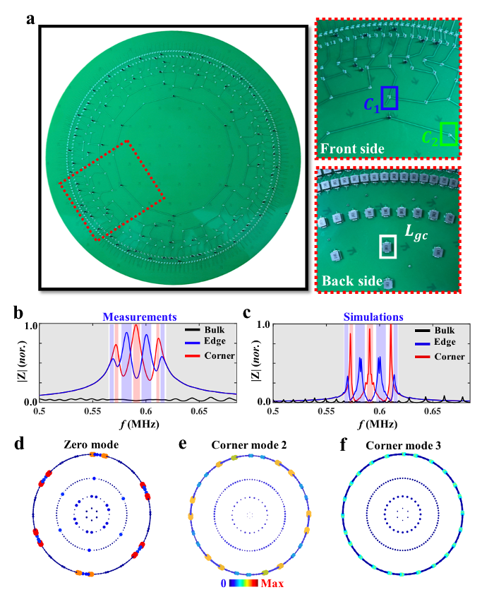 圖4. 基于雙曲電路網(wǎng)絡(luò),實(shí)驗(yàn)觀察高階雙曲零能模。