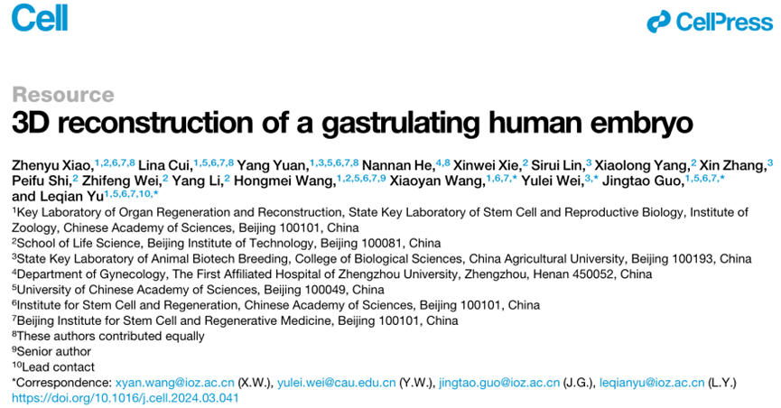 4月23日,北京理工大學生命學院肖振宇副教授、中國科學院動物研究所王紅梅研究員、于樂謙研究員、郭靖濤研究員等在國際學術期刊Cell發表文章《3D Reconstruction of a Gastrulating Human Embryo》,基于芯片技術和三維動畫重構技術首次重構高分辨率人類三維數字原腸胚,填補原腸胚階段人類胚胎發育知識空白,為理解人類早期胚胎發育及相關疾病提供重要資料,為改善不良妊娠結局奠定科學基礎。