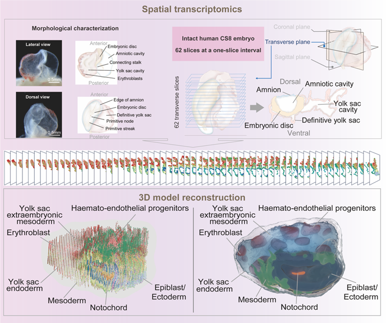 文章對CS8人類胚胎進行62張的連續切片,進行了Stereo-seq高分辨率的空間轉錄組研究。三維重構了人類CS8胚胎的3D模型,并鑒定了關鍵位置的一系列細胞亞型。整體性地描繪了胚胎形態、細胞類群、空間位置和轉錄組特征,闡述了原腸胚形成過程中細胞發育過程、譜系軌跡變化和一系列調控活動。開創性地發現了CS8時期的人類胚胎尾部很可能存在一個和中部脊索類似的信號源,為窺探人類極早期胚胎發育提供了重要窗口。
