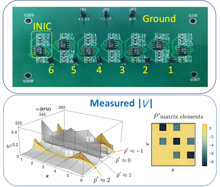 為了驗(yàn)證奇異束縛態(tài)的可實(shí)現(xiàn)性,研究人員還在他們的工作中展示了奇異束縛態(tài)的實(shí)驗(yàn)實(shí)現(xiàn)。具體實(shí)驗(yàn)電路如圖3上圖所示。與電路設(shè)計(jì)相對(duì)應(yīng),該電路中同樣含有6個(gè)節(jié)點(diǎn)。黃色虛線框中展示的是由集成電路運(yùn)放、電容和電阻構(gòu)成的INIC。上部三個(gè)點(diǎn)分別為保證集成運(yùn)放正常工作的正負(fù)電壓以及接地。通過(guò)該電路實(shí)驗(yàn),研究人員成功觀察到了奇異束縛態(tài)。相應(yīng)的實(shí)驗(yàn)結(jié)果展示在圖3下圖中。與圖2模擬結(jié)果相似,研究人員同樣在具體電路實(shí)驗(yàn)中測(cè)量了每個(gè)節(jié)點(diǎn)的電壓隨頻率的分布。高電壓同樣分布在4個(gè)頻率上。這4個(gè)頻率即為我們奇異束縛態(tài)系統(tǒng)的4個(gè)本征值,他們相應(yīng)的電壓即為本征態(tài)。