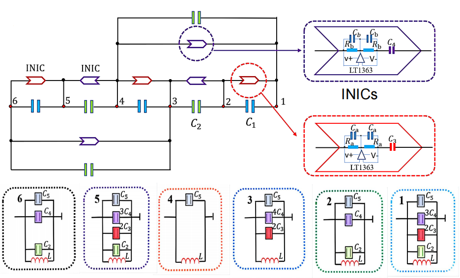 首先,研究人員基于量子薛定諤方程與電路基爾霍夫方程數(shù)學(xué)形式上的一致性,將奇異束縛態(tài)的晶格模型引入到電路模型中。他們的方案示意圖如圖1所示。該電路包含6個(gè)節(jié)點(diǎn)(標(biāo)記1-6),每個(gè)節(jié)點(diǎn)間通過(guò)電容和負(fù)阻抗轉(zhuǎn)換器(INIC)連接。INIC的具體結(jié)構(gòu)如右上側(cè)虛線框所示,它提供了電路中的非互易耦合連接。另外,每個(gè)節(jié)點(diǎn)都應(yīng)連接相應(yīng)的接地元件以保證在位能。這樣的一個(gè)電路網(wǎng)絡(luò)能夠與量子晶格模型之間存在良好的對(duì)應(yīng)關(guān)系。通過(guò)輸入電壓并測(cè)量共振頻率分布,研究人員就可以等效得到奇異束縛態(tài)的本征值和本征態(tài)等信息。