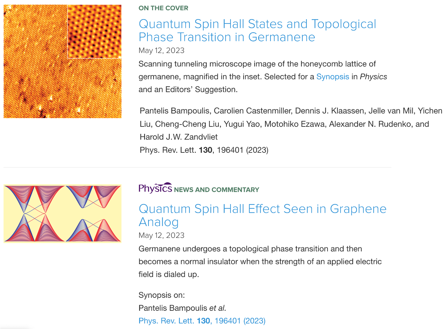 北京理工大學物理學院博士生劉一辰、劉鋮鋮教授和姚裕貴教授與合作者,包括荷蘭特文特大學Pantelis Bampoulis、Harold J.?W. Zandvliet教授及日本東京大學Motohiko Ezawa教授,實驗觀測到了鍺烯中的量子自旋霍爾態及拓撲相變。該成果5月12日發表在國際知名期刊《物理評論快報》上,并被選為該期的封面文章(Cover)和編輯推薦(Editors' Suggestion),同時也被美國物理學會Physics網站專題評論報道。該工作證實了姚裕貴團隊12年前的理論預言【Quantum Spin Hall Effect in Silicene and Two-Dimensional Germanium, Cheng-Cheng Liu, Wanxiang Feng and Yugui Yao, Phys. Rev. Lett. 107, 076802 (2011) SCI引用1894次;Low-energy effective Hamiltonian involving spin-orbit coupling in silicene and two-dimensional germanium and tin, Cheng-Cheng Liu, Hua Jiang and Yugui Yao, Phys. Rev. B 84, 195430 (2011) SCI引用988次】。