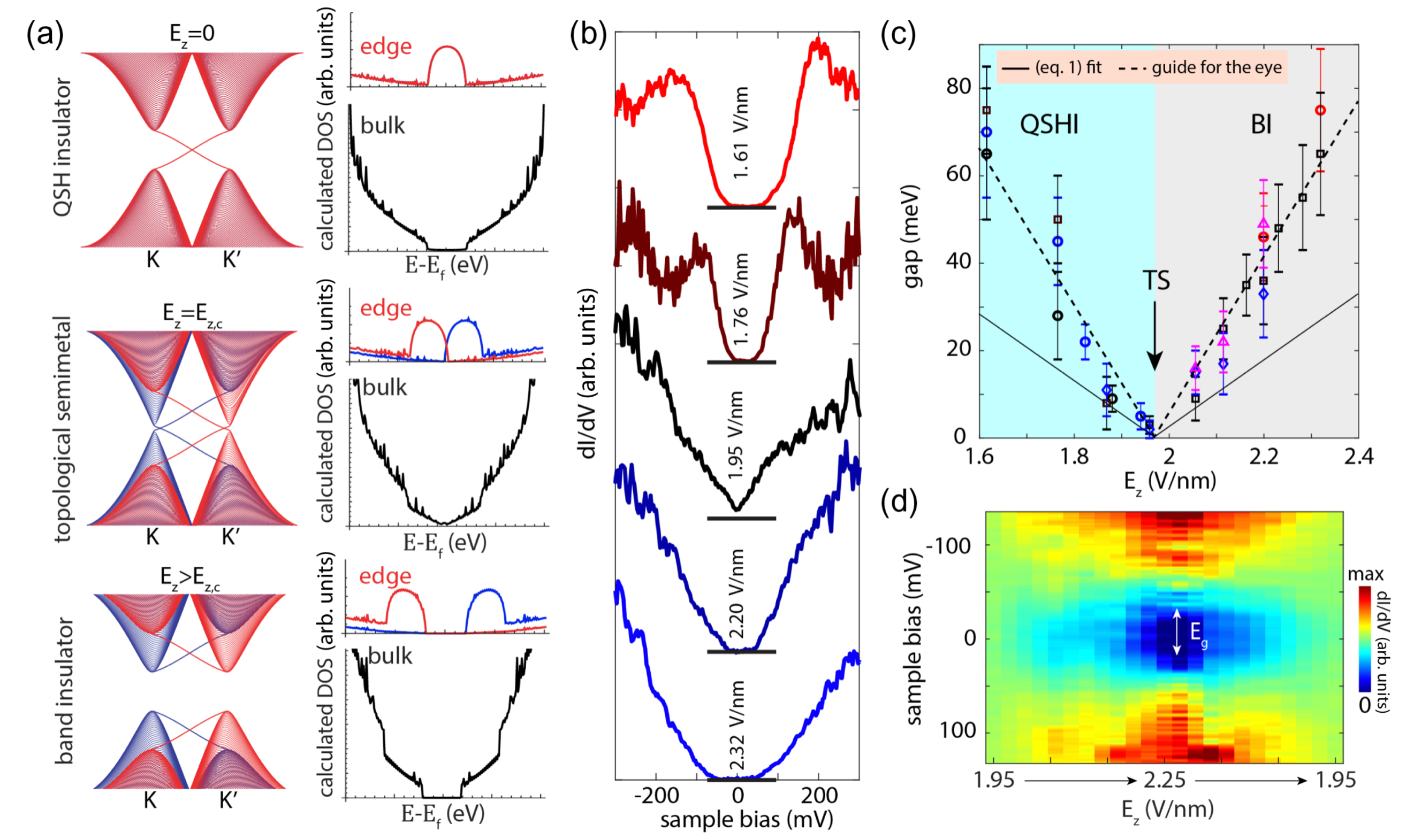 在該工作中,研究人員利用低溫掃描隧道顯微鏡/掃描隧道譜、密度泛函理論和緊束縛計算來證明Ge2Pt(101)上的外延鍺烯是一種具有起伏狀蜂窩結構的量子自旋霍爾絕緣體。在其量子自旋霍爾效應狀態下,鍺烯的拓撲特征在于存在體能隙和金屬性的拓撲邊緣態(圖1)。他們同時控制STM針尖到樣品隧道結中的內置電場以改變鍺烯的拓撲狀態:在臨界電場時,鍺烯的拓撲能隙會閉合,體系轉變為拓撲半金屬;而當電場超過臨界值時,鍺烯會打開拓撲平庸的帶隙,并伴隨著拓撲邊緣態的消失(圖2、圖3)。該工作給出了單元素量子自旋霍爾絕緣體中拓撲相變的第一個實驗證據。這種由電場引起的拓撲狀態切換和相當大的體能隙使鍺烯成為室溫拓撲晶體管的候選材料。