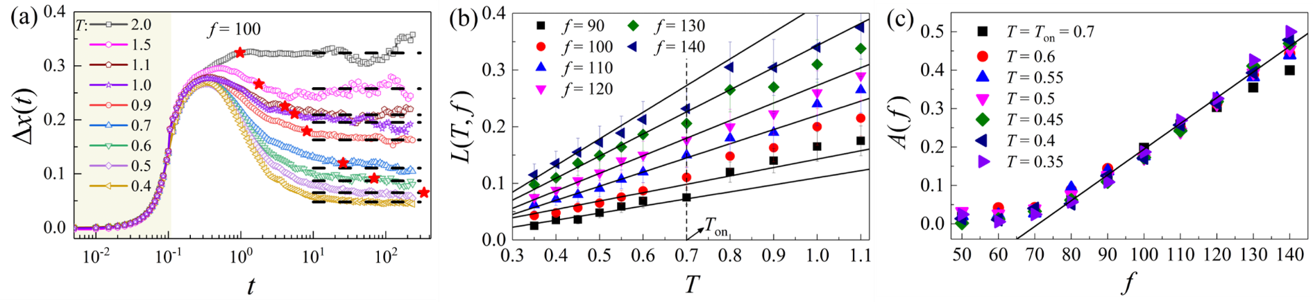 圖1 (a) 對粒子施加一外力,其大小f = 100時 (陰影區時間間隔內),粒子平均位移隨時間的變化,黑色虛線表示較長時間下平均位移趨近一平臺值,即不可逆位移L(T, f)。(b) 不同外力大小時,不可逆位移L(T, f)隨溫度的依賴規律。