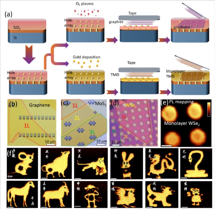 圖1 二維材料懸浮結構的制備路線圖(a)及解理后的二維材料(b-d),解理后的懸浮WSe2展現出良好的熒光特性(e)。(f)是將襯底圖案化(十二生肖圖案)加工后,通過優化解理工藝制備的懸浮WSe2熒光成像圖片。