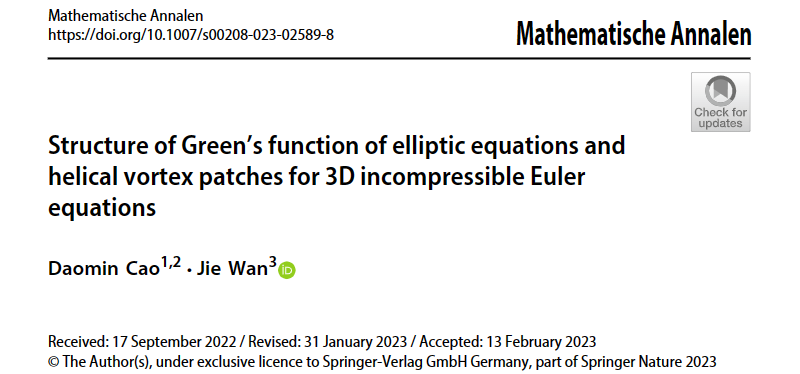 日前,北京理工大學數學與統計學院萬捷副研究員在國際學術期刊《Mathematische Annalen》發表題為“Structure of Green’s function of elliptic equations and helical vortex patches for 3D incompressible Euler equations”的研究論文。該論文給出了散度型二階橢圓算子Green函數的展開公式,并由此證明了無限管道區域上三維不可壓縮歐拉方程集中到渦絲方程的螺旋對稱渦補丁解的存在性和軌道穩定性。某種程度上給出了渦絲猜想在螺旋對稱情形下的一個證明。