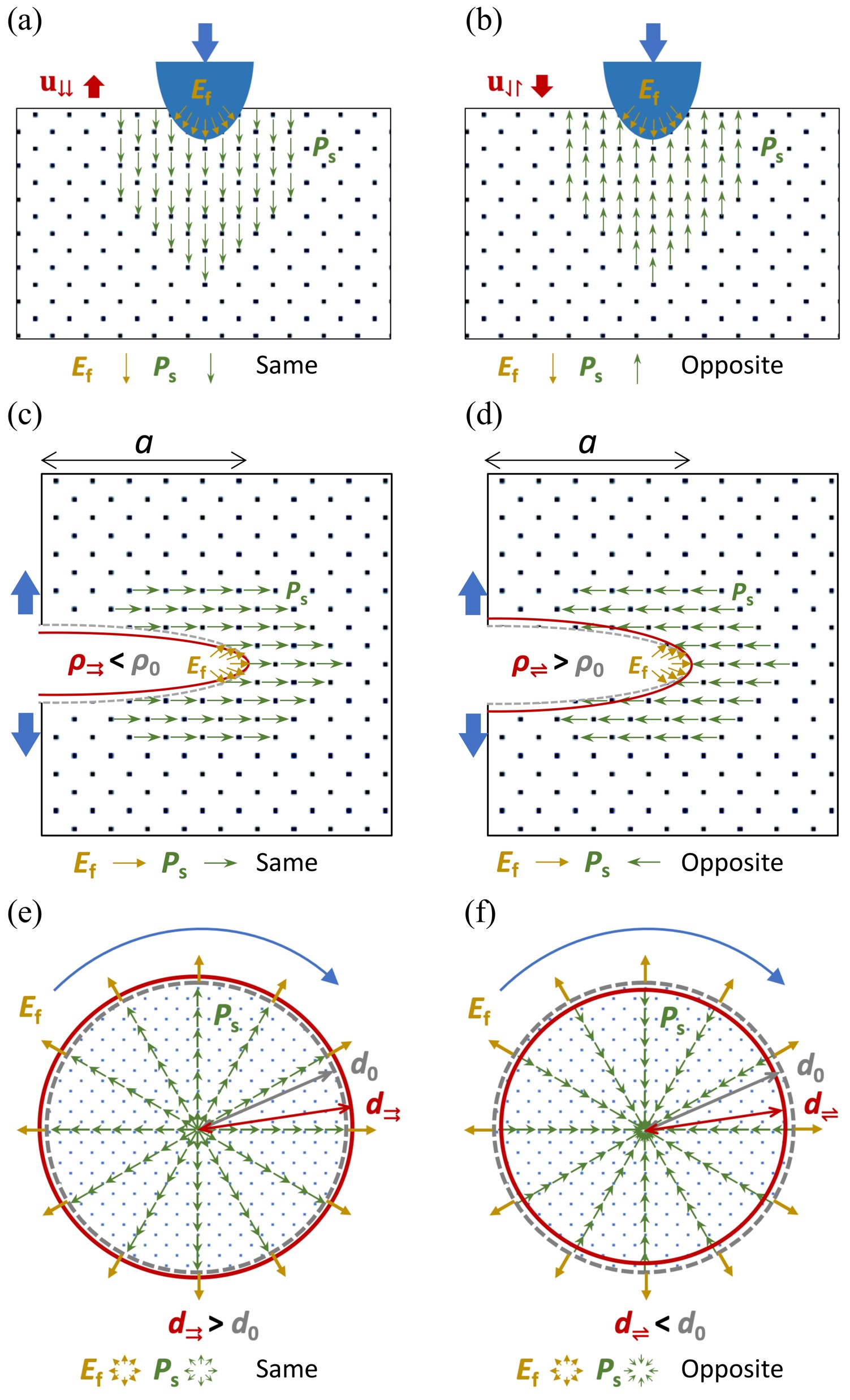圖3. 撓曲形變效應在鐵電體中誘導的(a,b)非對稱納米壓痕,(c,d) 非對稱裂紋擴展現象,以及預測的(e,f) 非對稱扭轉力學行為。