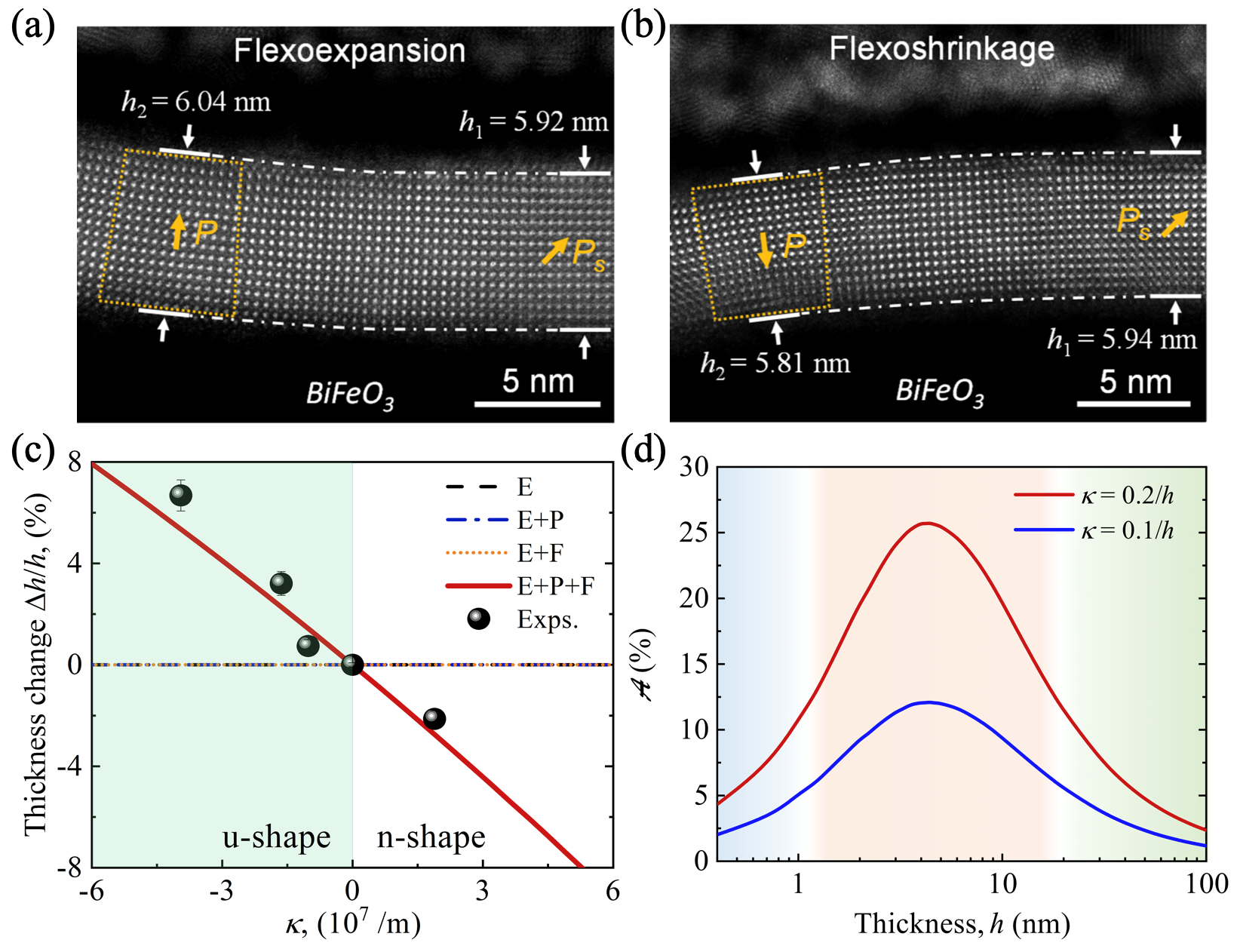 圖2. (a,b)鐵電薄膜中依賴于自發極性取向的非對稱彎曲厚度膨脹/收縮力學行為。(c) 依賴于薄膜彎曲曲率的厚度。(d) 非對稱彎曲剛度的尺寸效應。