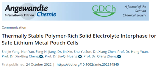 論文詳情:Shi-Jie Yang, Nan Yao, Feng-Ni Jiang, Jin Xie, Shu-Yu Sun, Xiang Chen, Hong Yuan, Xin-Bing Cheng,* Jia-Qi Huang,* Qiang Zhang*. Thermally Stable Polymer-Rich Solid Electrolyte Interphase for Safe Lithium Metal Pouch Cells, Angew Chem Int Ed, 2022, e202214545.