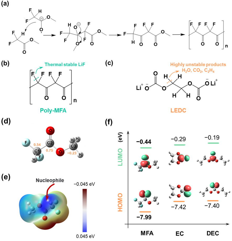 設(shè)計的二氟乙酸甲酯(MFA)可以在金屬鋰負(fù)極表面發(fā)生Claison酯縮合反應(yīng),其特殊的–CHF2基團帶來的親核位點使其可以極快地形成富聚合物層,并且聚合物的高氟含量可以為界面層提供較好的熱穩(wěn)定性(圖2)。