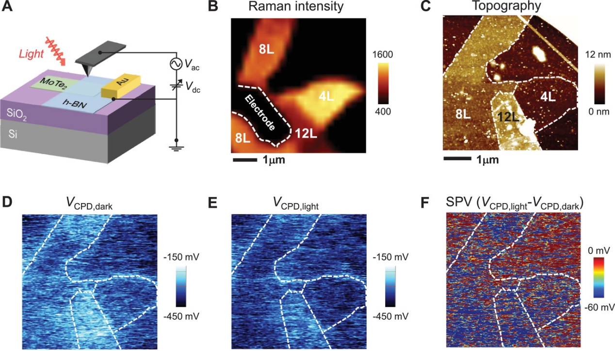圖3. 表面光電壓表征。(A)用于研究接觸電位差(VCPD)的KPFM基測量裝置的示意圖。(B)拉曼強度成像。(C)形貌圖像。(D&E)在黑暗條件和λ="635" nm光照下的接觸電位差(VCPD)成像。(F)SPV成像,由VCPD在黑暗條件下和光照條件下的差異定義。
