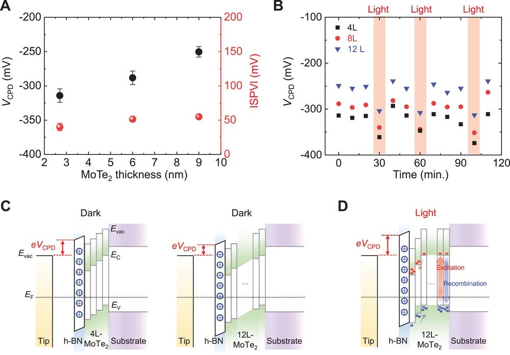 圖4. SPV特性的解釋和相應的能帶圖。(A)在黑暗條件下與MoTe2厚度相關的VCPD和SPV值。(B)在黑暗條件下和光照下,三種不同厚度(由h-BN層覆蓋)MoTe2的時間分辨VCPD測量。(C&D)在黑暗條件和光照下,被h-BN層覆蓋的4層和12層MoTe2的能帶示意圖。
