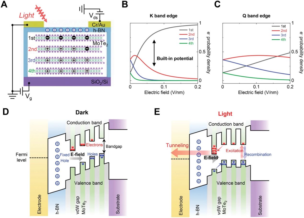 圖1. 隧穿光電晶體管中MoTe2 K能帶邊緣的軌道柵控。(A)基于四層MoTe2和h-BN隧穿勢壘的隧穿光電晶體管的示意圖。(B&C)MoTe2 K能帶邊緣和Q能帶邊緣層相關的電子概率密度。(D&E)黑暗條件下和光照下隧穿光電晶體管的能帶示意圖。