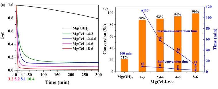 圖1 (a)純Mg(OH)2和MgCeLi-x-y復(fù)合材料在270℃下的等溫動(dòng)力學(xué)曲線;(b) 純Mg(OH)2和MgCeLi-x-y復(fù)合材料在270℃下的最大轉(zhuǎn)化率和轉(zhuǎn)化時(shí)間的對(duì)比。