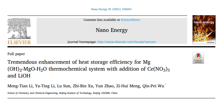 近期,北京理工大學(xué)化學(xué)與化工學(xué)院武欽佩教授團(tuán)隊(duì)在儲(chǔ)能科學(xué)技術(shù)領(lǐng)域取得階段成果。研究成果以“Tremendous enhancement of heat-storage efficiency for Mg(OH)2-MgO-H2O thermochemical system with addition of Ce(NO3)3 and LiOH”為題,12月18日在線發(fā)表于 Nano Energy  (https:///doi.org/10.1016/j.nanoen. 2020.105603)。北京理工大學(xué)化學(xué)與化工學(xué)院研究生李夢(mèng)甜和李亞婷為共同第一作者,北京理工大學(xué)是唯一作者單位。
