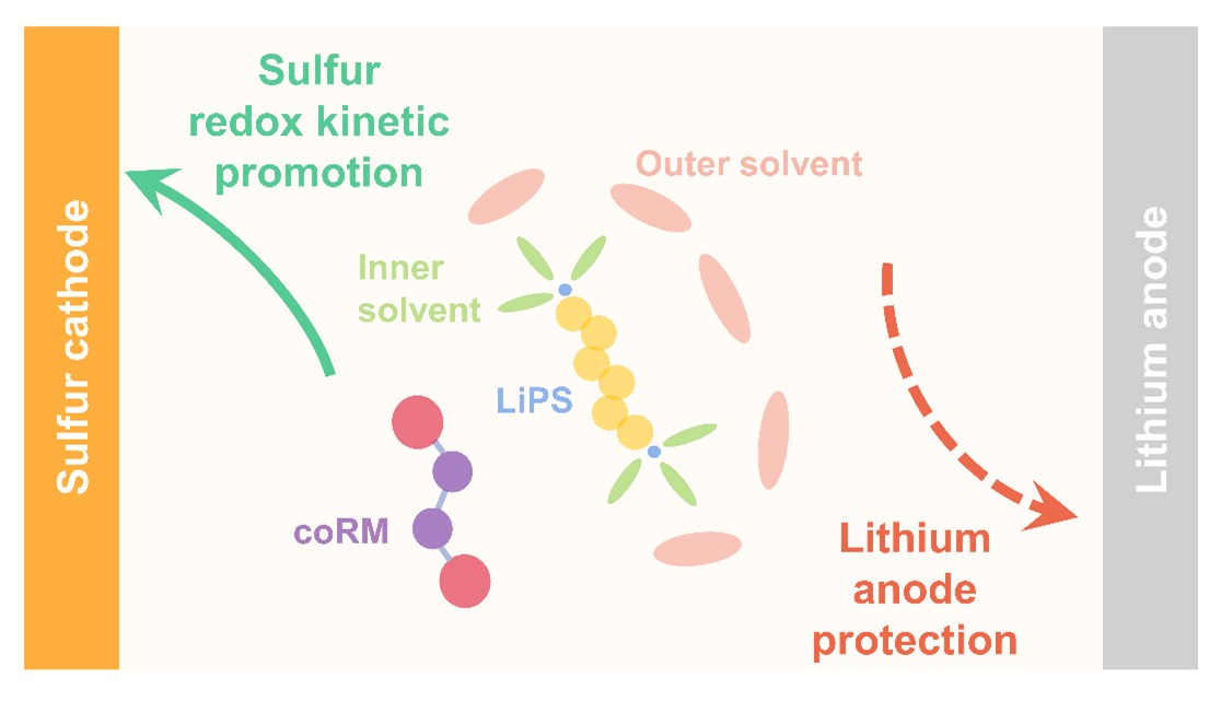針對上述問題,北京理工大學前沿交叉科學研究院黃佳琦教授研究團隊提出了一種利用氧化還原輔介體(coRM)提升 EPSE 鋰硫電池中硫正極氧化還原動力學的策略,用以構建兼具高能量密度和長循環壽命的鋰硫軟包電池器件。