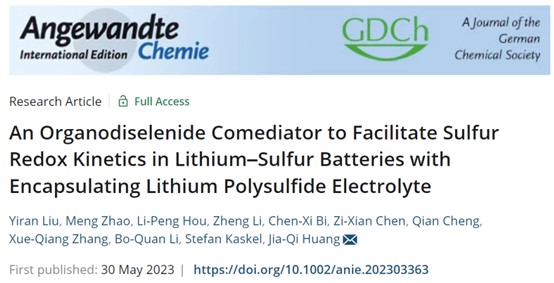 論文詳情:Yiran Liu, Meng Zhao, Li-Peng Hou, Zheng Li, Chen-Xi Bi, Zi-Xian Chen, Qian Cheng, Xue-Qiang Zhang, Bo-Quan Li,* Stefan Kaskel, and Jia-Qi Huang*. Organodiselenide Comediator to Facilitate Sulfur Redox Kinetics with Encapsulating Lithium Polysulfide Electrolyte, Angewandte Chemie International Edition, DOI:10.1002/anie.202303363.