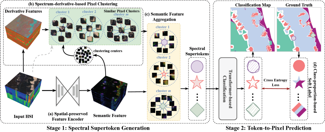 高光譜圖像分類是一項將預定義類別分配給遙感場景高光譜圖像中每個像素的任務,由于忽略了光譜相似像素之間的相關性,導致邊緣定義不準確,難以管理相鄰區(qū)域中的微小光譜變化。為此,科研團隊提出了一種創(chuàng)新性的雙階段光譜超像素分類網(wǎng)絡(DSTC)架構(gòu),具體如圖1所示。引入了受超像素概念啟發(fā)的新型雙級光譜Supertoken分類器 (DSTC)。主要采用基于光譜導數(shù)的像素聚類,將具有相似光譜特征的像素分組為光譜超級標記。通過將標記的分類投影到圖像空間上,獲得了像素級結(jié)果,保持了區(qū)域分類一致性和精確邊界。此外,根據(jù)標記內(nèi)的多樣性,構(gòu)建了一種基于類比例的軟標簽。該標簽根據(jù)不同類別的普遍性自適應地為其分配權重,有效應對地物分布不均的問題,增強了分類算法的精度。