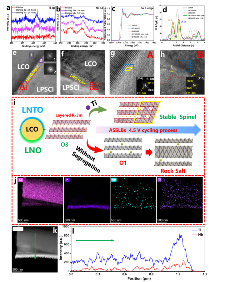 圖1(a-b)循環后電池正極側的Ti 2p,Nb 3d的XPS深度分析結果,(c-d)Co的XAFS K邊吸收譜及相對應的R空間圖,(e)LNTO@LCO循環后界面處的TEM圖與FFT結果,(f)LNO@LCO循環后界面處的TEM圖,(g)A處TEM放大圖及對應區域的FFT結果,(h)B處TEM放大圖及對應區域的FFT結果,(i)元素偏析的作用及在循環過程中LCO相變轉化的示意圖,(j)循環后正極的Co、P、Nb、Ti的EDS Mapping結果,(k-l)HAADF圖像和相對應的元素線性分布圖。