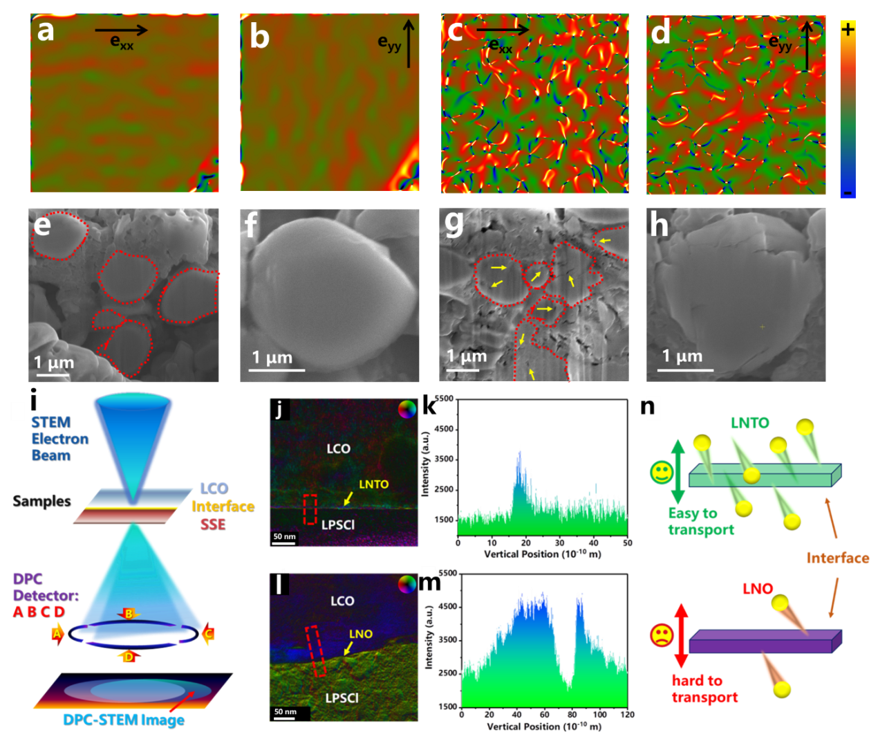 圖2(a-b)LNTO@LCO正極循環后的x、y方向的GPA應力分布圖,(c-d)LNO@LCO正極循環后的x、y方向的GPA應力分布圖,(e-f)LNTO@LCO循環后顆粒的截面圖及放大的顆粒圖,(g-h)LNO@LCO循環后顆粒的截面圖及放大的顆粒圖,(i)DPC-STEM測試原理的示意圖,(j-k)LNTO@LCO界面處的DPC圖及電荷強度分布圖,(l-m)LNO@LCO界面處的DPC圖及電荷強度分布圖,(n)界面處離子傳輸示意圖。