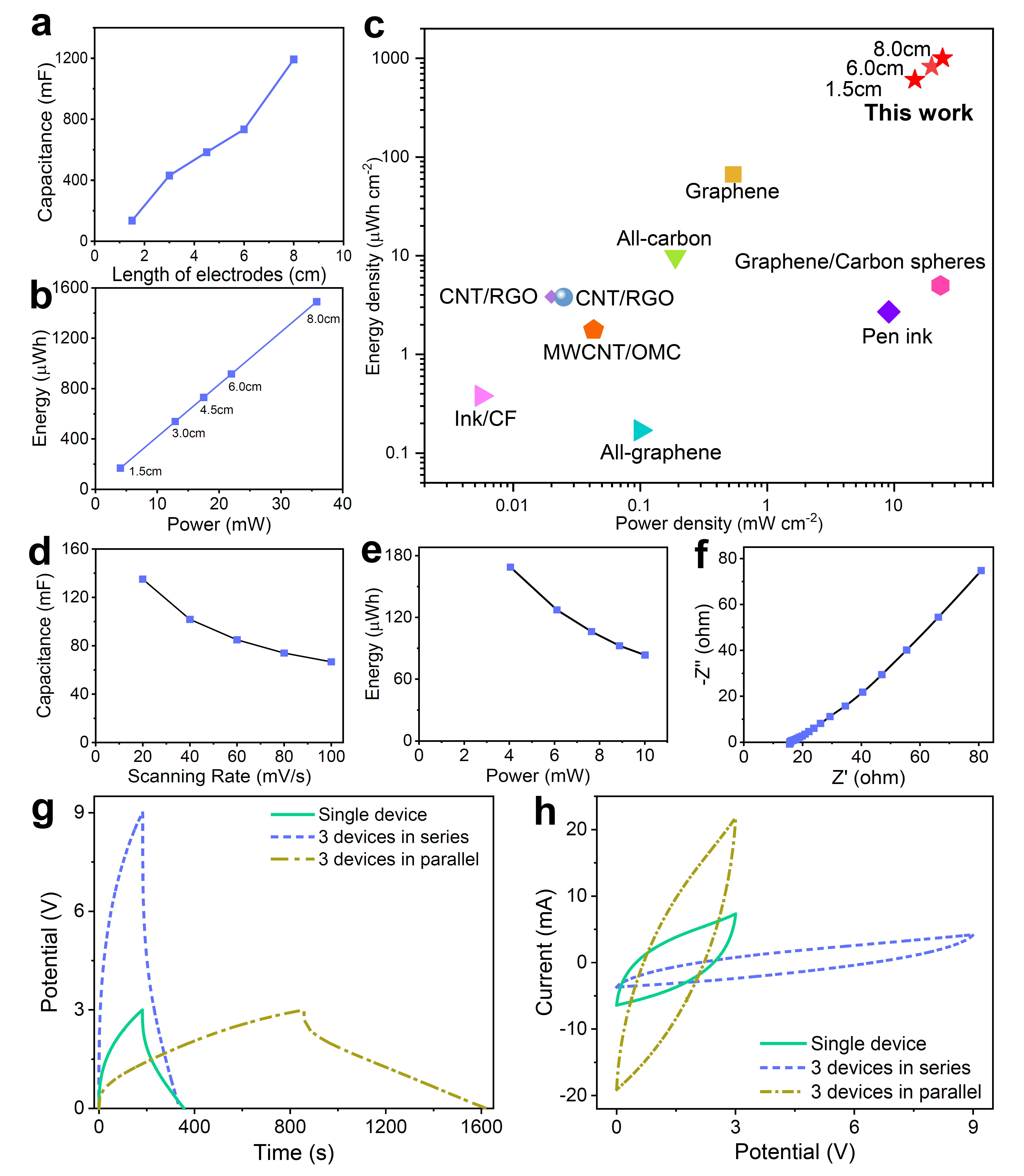 對不同電極長度(1.5~8.0 cm )的超級電容器進行電化學性能評價。電極長度從1.5 cm到8.0 cm,電容值從135 mF到1193 mF不等。計算得到的面積、質量和體積比電容值分別為803 mF cm -2、11.7 F g - 1和11.0 F cm -3。相應地,SC的能量和功率隨著電極長度的增加而增加(圖2b),當電極長度為8.0 cm時,SC的能量和功率分別達到最大值1490 μWh和35.8 mW。此外,SC可以很容易地進行串并聯組裝,以滿足各種能源需求場景。圖2g和2h展示了三個1.5 cm長的SCs串聯和并聯的恒流充放電(GCD)和循環伏安(CV)曲線,顯示出SC優越的電化學性能。