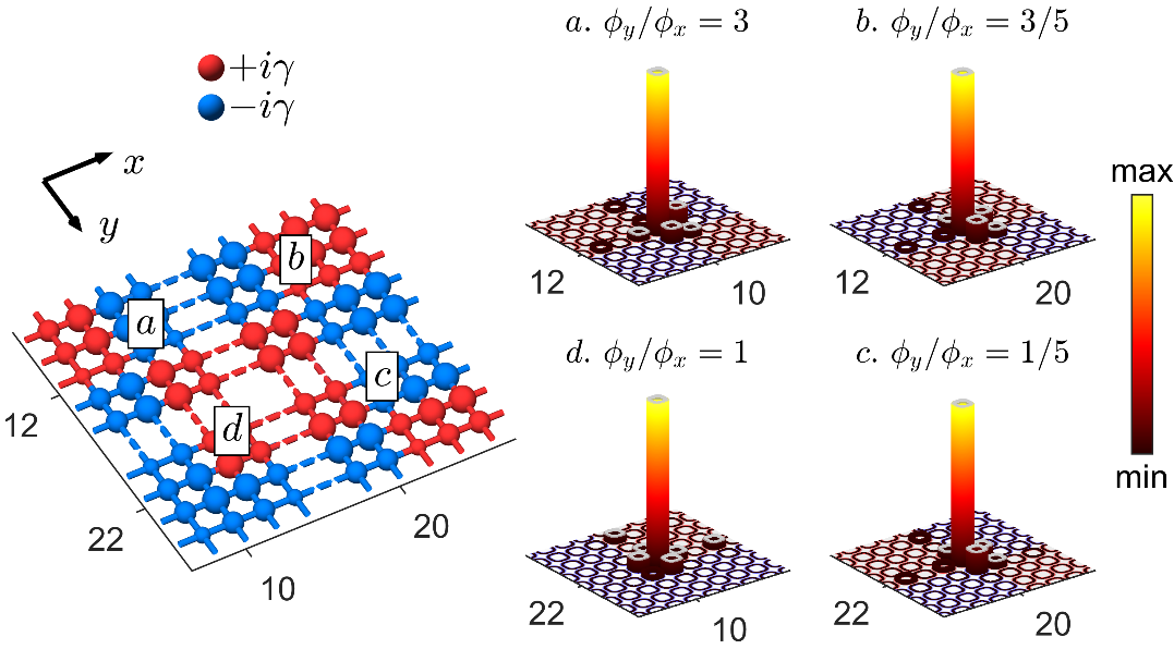 為了給出更加普適的研究方法,研究團隊研究了AAH模型、SSH模型、谷光子晶體和C6v類型的光子晶體等多種常見的非厄米拓撲光子學體系,提出了一種通過引入不同疇拓撲態之間耦合系數來構建體系有效哈密頓量的新方法,為研究新型增益-損耗疇壁拓撲光學體系提供了較為普適的研究方案。在由緊束縛哈密頓量H_1D描述的一維AAH構型中,使用擬合的方法確定有效哈密頓量H_eff的相關參數,理論計算發現有效哈密頓量H_eff可以準確的描述相應拓撲態的模式分布與模式頻率(圖1)。同時,研究團隊將該方法推廣至高維,通過在二維AAH構型中構造十字形的增益-損耗界面,還實現了由增益-損耗疇壁誘導的拓撲角態,并成功構建出有效哈密頓量分析相應現象,通過適當調整體系參數與體系內的增益損耗分布,可以在二維體系內的不同位置誘導出拓撲角態(圖2)。這一工作揭示了由增益-損耗疇壁誘導的拓撲態的產生機制,同時對有源調控拓撲態具有指導意義。