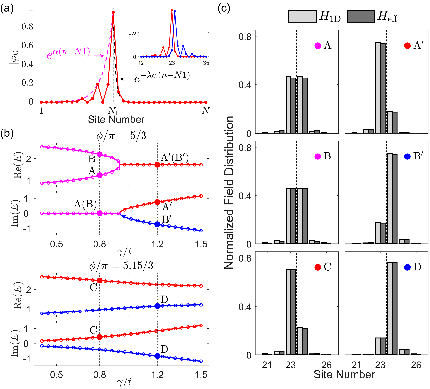 圖1 (a)通過引入參數擬合有效哈密頓量中的耦合項。(b),(c) 分別由H_1D與H_eff得出的模式頻率與模式分布的比較。